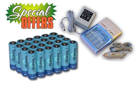 Charger * Great deal on a fast charger for both in house and travel charging * Recharges 2 or 4 pieces Size AAA, AA Ni-MH & Ni-Cd batteries in 2-3 hours * Includes "intelligent" microprocessor controlled charging, identifies defective cells and a safety timer for complete overcharge protection * Powered by an external AC adaptor for both indoor use or for in car usage by a cigarette lighter plug to your car. * Also recharges inside a car with the included cigarette lighter plug to your 12V car battery * Negative Delta V Cut off feature to 100% protect your batteries * With mechanical design against wrong polarity and short circuit protection * Automatic charge current selection for AA & AAA batteries * Red LED indicates charging; green LED indicates charging completed and charger is in "trickle charge" mode * Especially designed for rechargeable batteries used in Digital Camera, Handheld PC, PAD, Game Boy and CD players and other high drain rate electronic devices. High Capacity Rechargeable Batteries * High quality AA Size rechargeable Nickel Metal Hydride (Ni-MH) battery, top of line. * Exact replacement for standard AA size battery in all the devices * Provides ultra long use time per charge with this ultra high 2600 mAh capacity * Advanced Ni-MH technology means twice longer use life per charge than the ordinary rechargeables * Designed for enhanced performance for high drain applications such as digital cameras, CD players, portable audio devices, hand held games, 2-way radios, PDAs, and other portable high drain digital electronics * Can be recharged for up to 1000 times, providing big saving by replacing hundreds of throw away AA batteries. * Convenient operation without memory effect. Can be charged anytime. * Can be rapidly charged with any quick charger, smart chargers, plug in charger or universal chargers * Battery tested based on International Electronic Commission (IEC) standard to ensure capacity, quality and life time